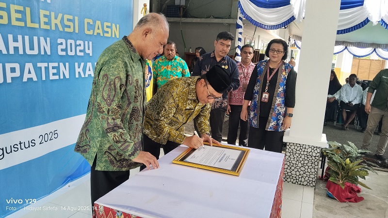 BUPATI KAIMANA TUTUP SECARA RESMI SELEKSI PPPK TAHAP II KOMINFO KAIMANA —  Pemerintah Kabupaten Kaimana secara resmi menutup pelaksanaan Seleksi Pegawai Pemerintah dengan Perjanjian Kerja (PPPK) Tahap II Tahun 2024. Penutupan dilakukan langsung oleh Bupati Kaimana, Drs. Hasan Achmad, M.Si, pada hari Kamis (14/08/2025), bertempat di halaman Kantor BKPSDM Kaimana. Acara tersebut turut dihadiri oleh