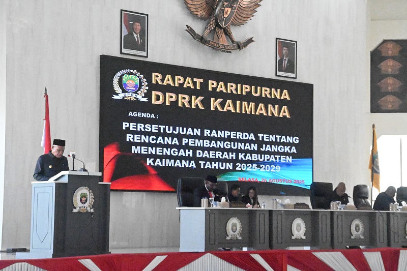 KOMINFO KAIMANA— Pemerintah Kabupaten Kaimana secara resmi menyampaikan Nota Pengantar atas Rancangan Peraturan Daerah (Ranperda) tentang Rencana Pembangunan Jangka Menengah Daerah (RPJMD) Kabupaten Kaimana Tahun 2025–2029 yang disampaikan oleh Bupati kaimana Drs. Hasan Achmad, M.Si., pada hari Senin (25/08/2025) dalam Rapat Paripurna DPRK Kaimana yang digelar di Ruang Auditorium DPRK Kaimana, Dalam penyampaiannya, Bupati menegaskan