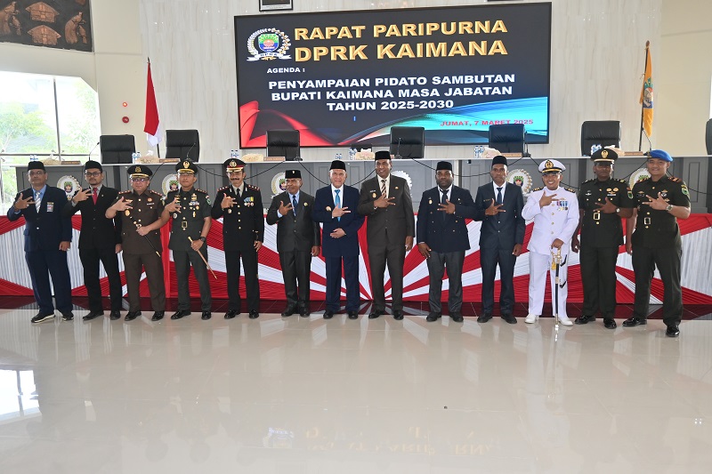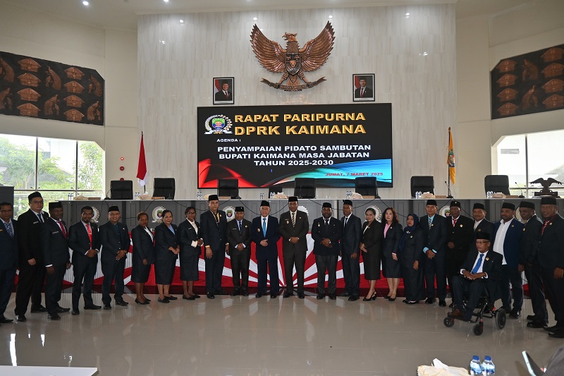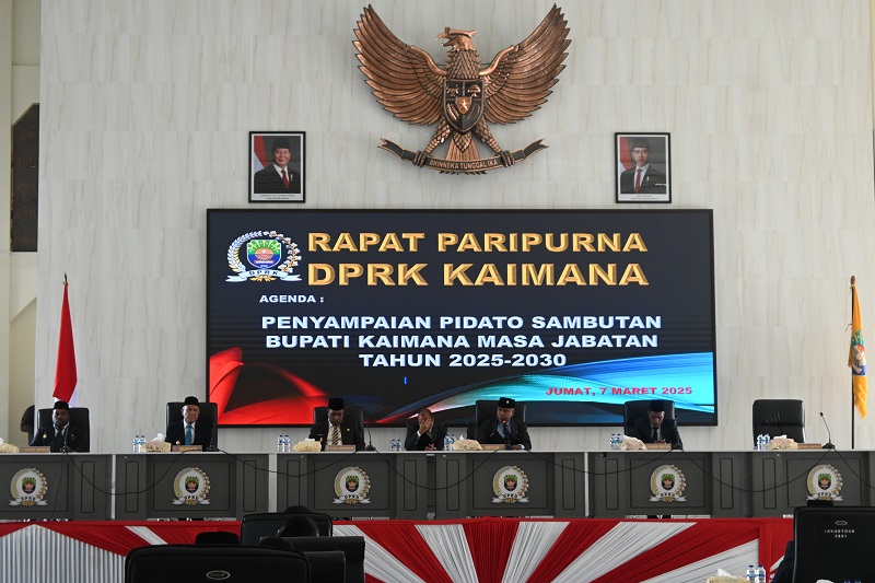 KOMINFO KAIMANA – Bupati Drs. Hasan Achmad, M.Si., dan Wakil Bupati Isak Wariensi, beserta Wakil Gubernur Papua Barat Drs. Mohammad Lakotani, M.Si., menghadiri Rapat Paripurna Dewan Perwakilan Rakyat Kabupaten (DPRK) Kaimana dengan agenda Penyampaian Pidato Bupati Kaimana Periode 2025-2030, pada hari Jumat (07/03/2025) bertempat di Auditorium DPRK Kaimana.