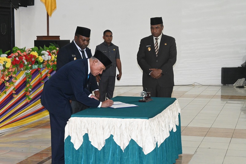 Penandatanganan Berita Acara Serah Terima Jabatan dari Pejabat Lama kepada Pejabat Baru yang disaksikan oleh Wakil Gubernur Papua Barat beserta seluruh hadirin yang hadir dalam gedung Serbaguna Krooy Kaimana